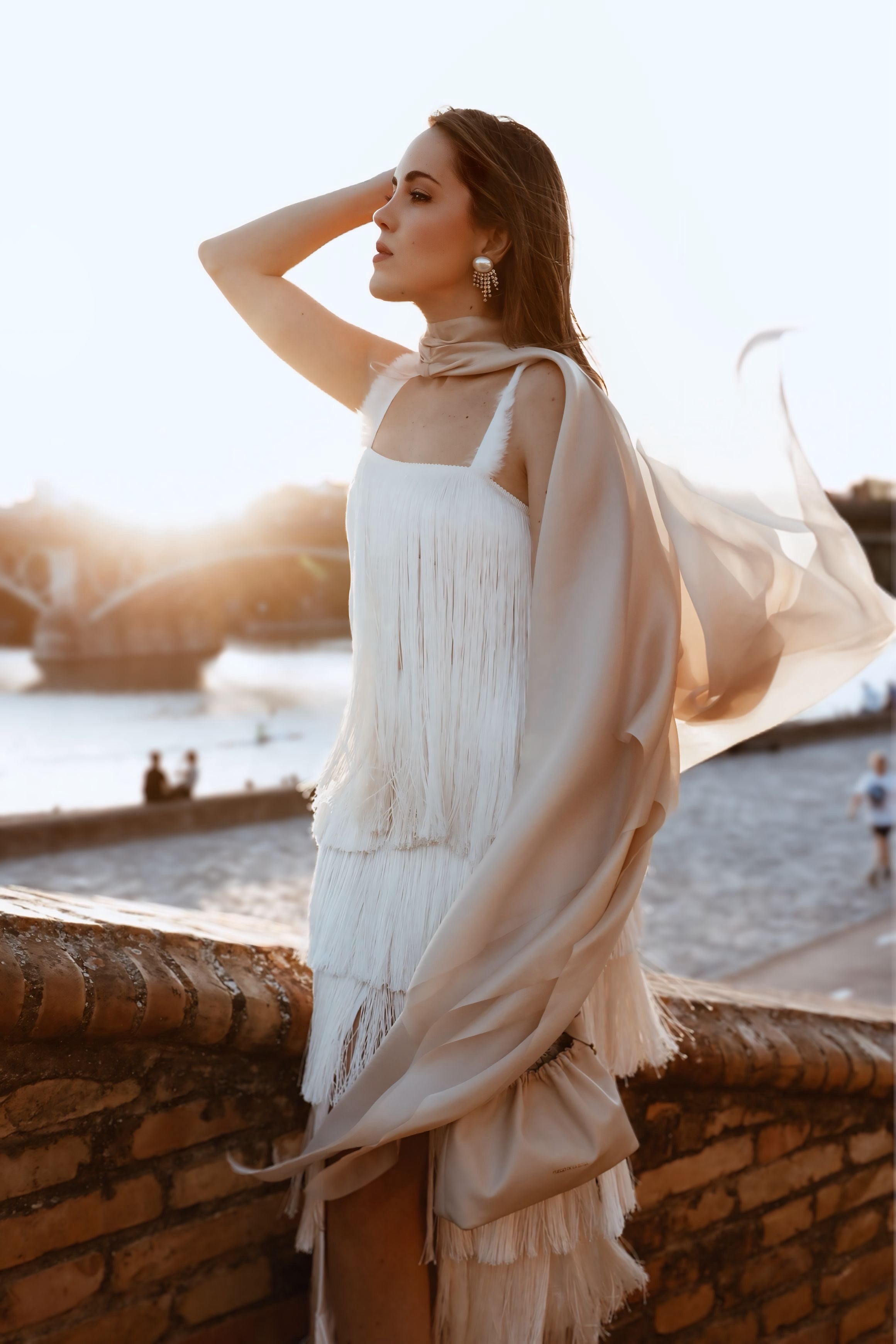Top de flecos largos marfil con tirantes de pelo. Tallas: XS,S,M,L Material: Crep de punto Scuba (80% poliéster, 20% elastano), flecos de seda y pelo sintético El color de la...